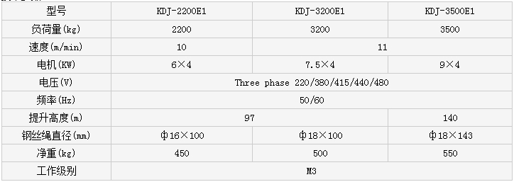商場專用電動葫蘆KDJ-2200E1-3200E1-3500E1技術(shù)參數(shù):